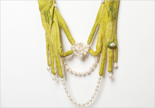 necklace, 2026, BURGTHEATER, historical gloves (deer leather), Viennese fittings (brass), cultured pearls, peridot pearls, silk, brass