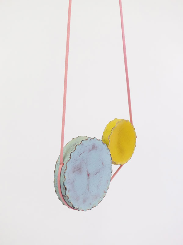 At the beginning of my working process, structures and patterns are etched in metal, mainly in copper. Afterwards I build metal containers, which I mostly inflate by creating a vacuum. This process is very intuitive and the body volume of the metal containers differ from relatively flat to extremely inflated. Thereafter I enamel the hollow bodies and sand the color down again until it´s nearly dissolved. Often this part of the process is done several times by applying new color tones and sanding them off again. This happens repeatedly until the moment of satisfaction is reached.