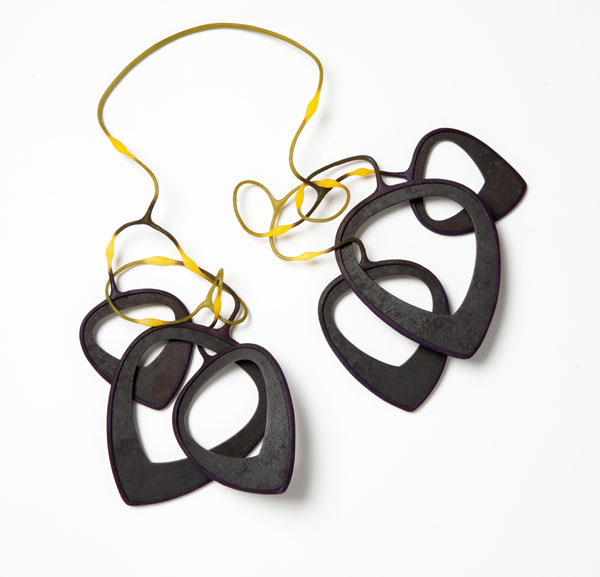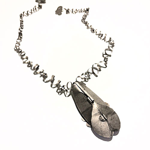 So versuche ich ein problematisches technisches Material, welches vielleicht auch im Krieg eingesetzt wurde, in Schmuck zu verwandeln, der von Verletzlichkeit, Nähe und Erotik erzählt und dennoch seine schroffe Materialität nicht verleugnet.