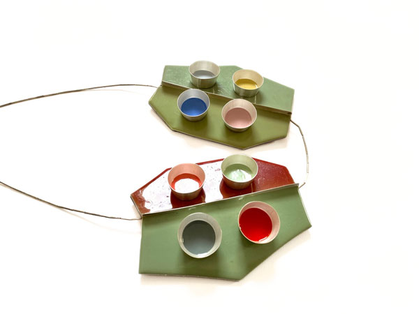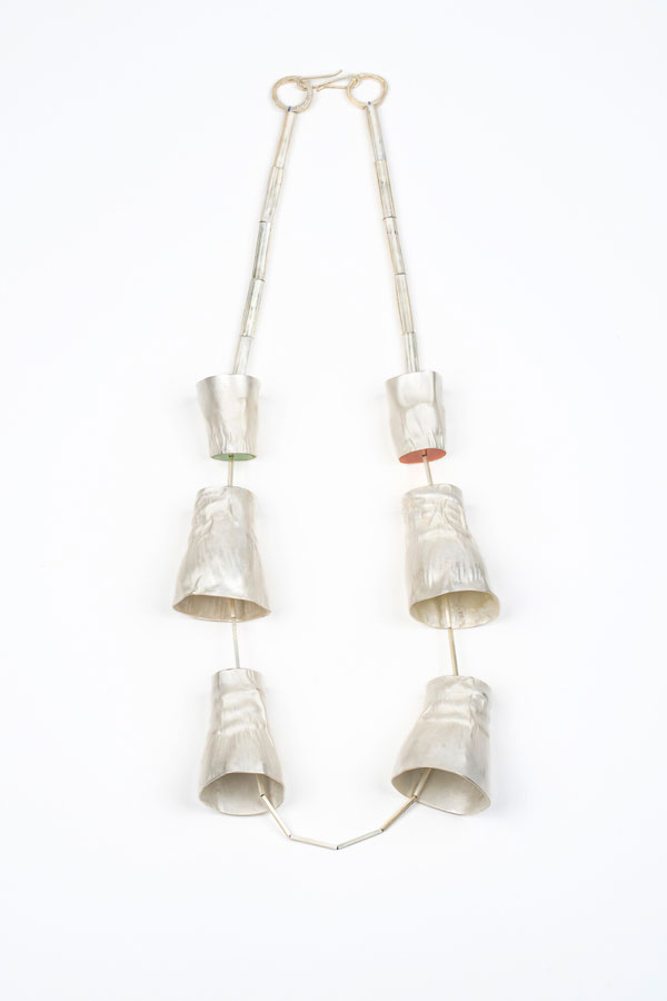 The artist Margit Jäschke describes herself as a wanderer between the worlds of different arts. Defying the conventional bounds of installation, painting, sculpture, and jewelry design, she has created an entirely distinctive oeuvre with fascinating forms, deliberately blurring the distinction between wearable ornament and autonomous art. Details become meaningful, evoking a variety of associations in the beholder. The jewelry object reveals vistas of fantastic worlds and conjures up what had been forgotten.